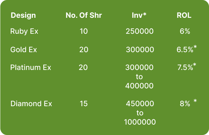 - 6. ROI 6% TO Maximum 8% Each Month For Next 20 Month Asper Investment & Designation.
